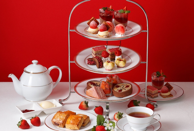 苺の赤色を基調に、素材本来の甘い香りを活かしたスイーツ、さらにセイボリーやスコーンにおいても苺を味わえる、今冬必食の苺尽くしアフタヌーンティー。