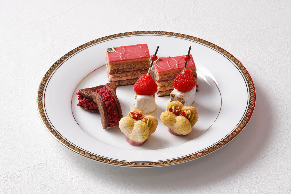 スイーツは苺とラズベリーのジュレとチョコレートパンナコッタを重ねたヴェリーヌをはじめ、苺のバタークリームで仕上げたオペラやミルフィーユ、マカロン、ガナッシュなどバリエーション豊かにラインナップし、ティースタンドを華やかに彩ります。