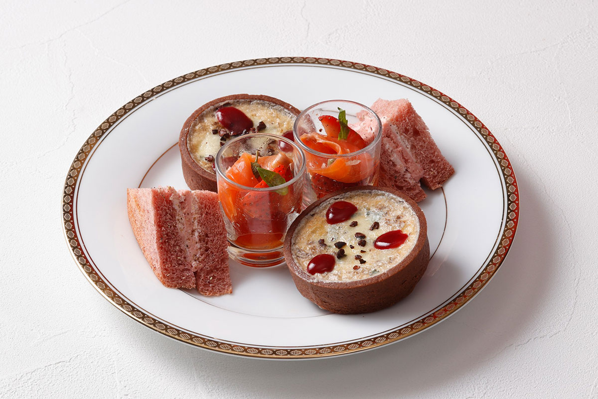 セイボリーにも苺が使用され、サワークリームと黒胡椒がアクセントのバターサンドや、苺とスモークサーモンのサラダなど個性豊かなメニューが勢揃い。