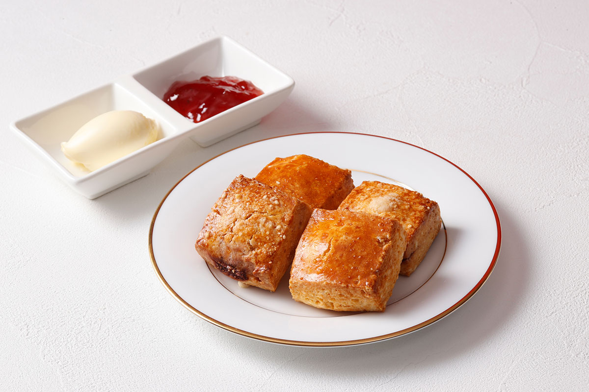 アフタヌーンティーの定番人気スコーンもプレーンに加え、苺とチーズのスコーンを取り揃え、コンディメントは苺ジャムとクロテッドクリームを楽しめます。