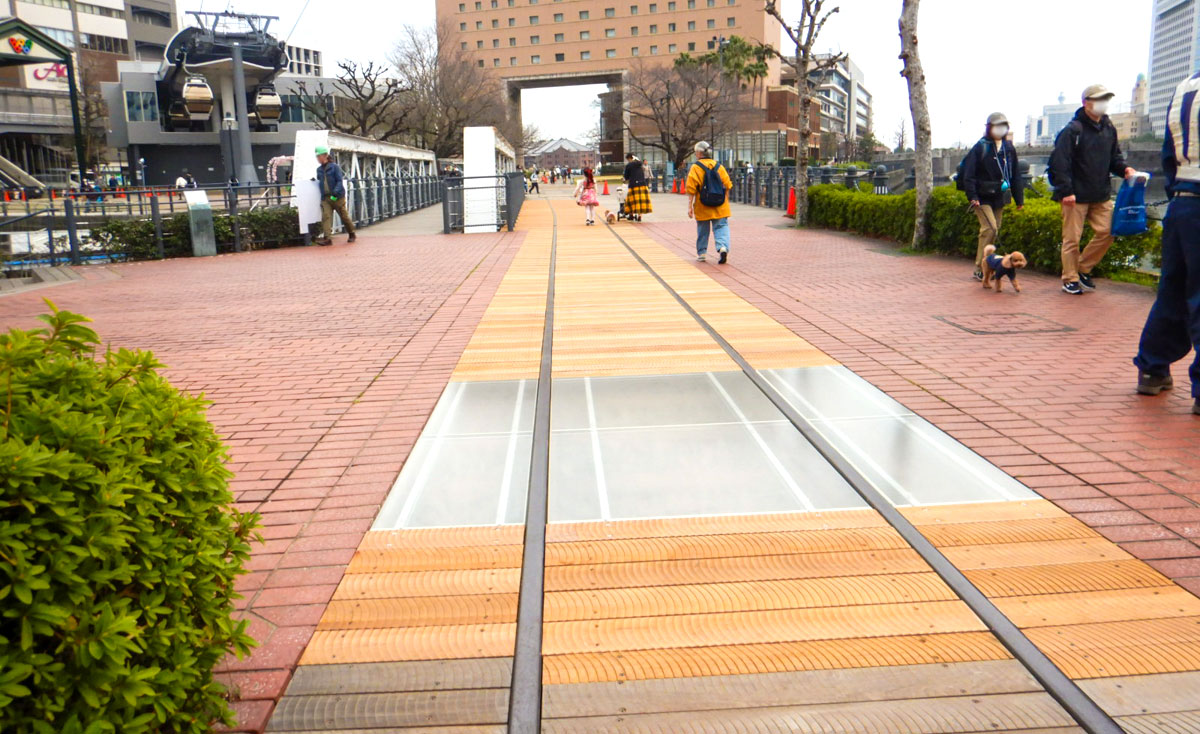 ウッドデッキの表面にレールが見える特徴的なデザインが市民に親しまれ、みなとみらいの景観を眺めながら散策できる観光客からも人気のスポットです。