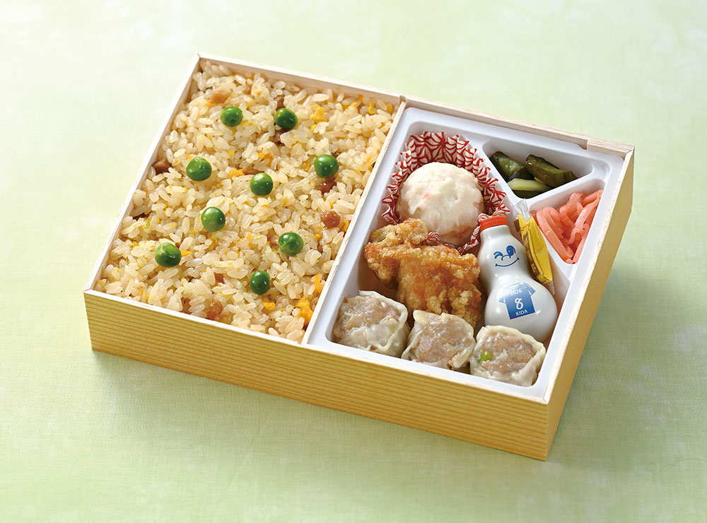 お弁当は「チャーハン」をメインに昔ながらのシウマイや鶏の唐揚げなど人気のおかずを詰め合わせ、今年は崎陽軒の公式キャラクター・ひょうちゃんと、横浜F・マリノスの公式キャラクター・マリノス君、マリノスケ、マリンが揃ったJ1百年構想リーグ限定の掛け紙を纏って登場!