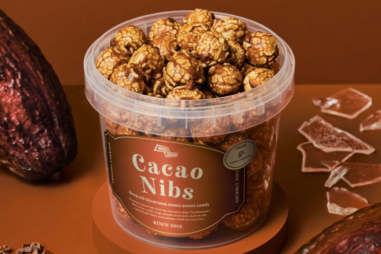 横浜発のクラフトチョコレート専門店「VANILLABEANS(バニラビーンズ)」と、東京・中目黒発のグルメポップコーン専門店「HillValley(ヒルバレー)」は、共同開発したポップコーン「カカオニブ」を2026年4月16日(木)より展開します。